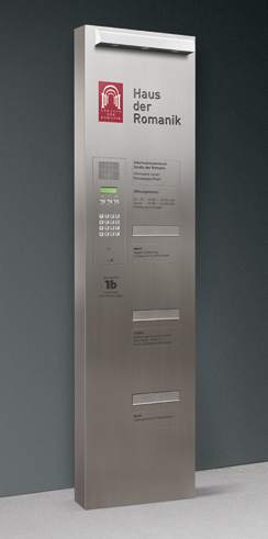 Standsäulen, Briefkästen Farben und Personalisierung im Corporate DesignNeben Edelstahl-„Natur“ können die Stelen und Pylone auch in fast allen RAL-Tönen, z. B. in den Unternehmensfarben pulverbeschichtet werden. Zudem lassen sie sich farbig bedrucken, oder mit geplotteten Folien (z. B. Firmenlogo) bekleben.